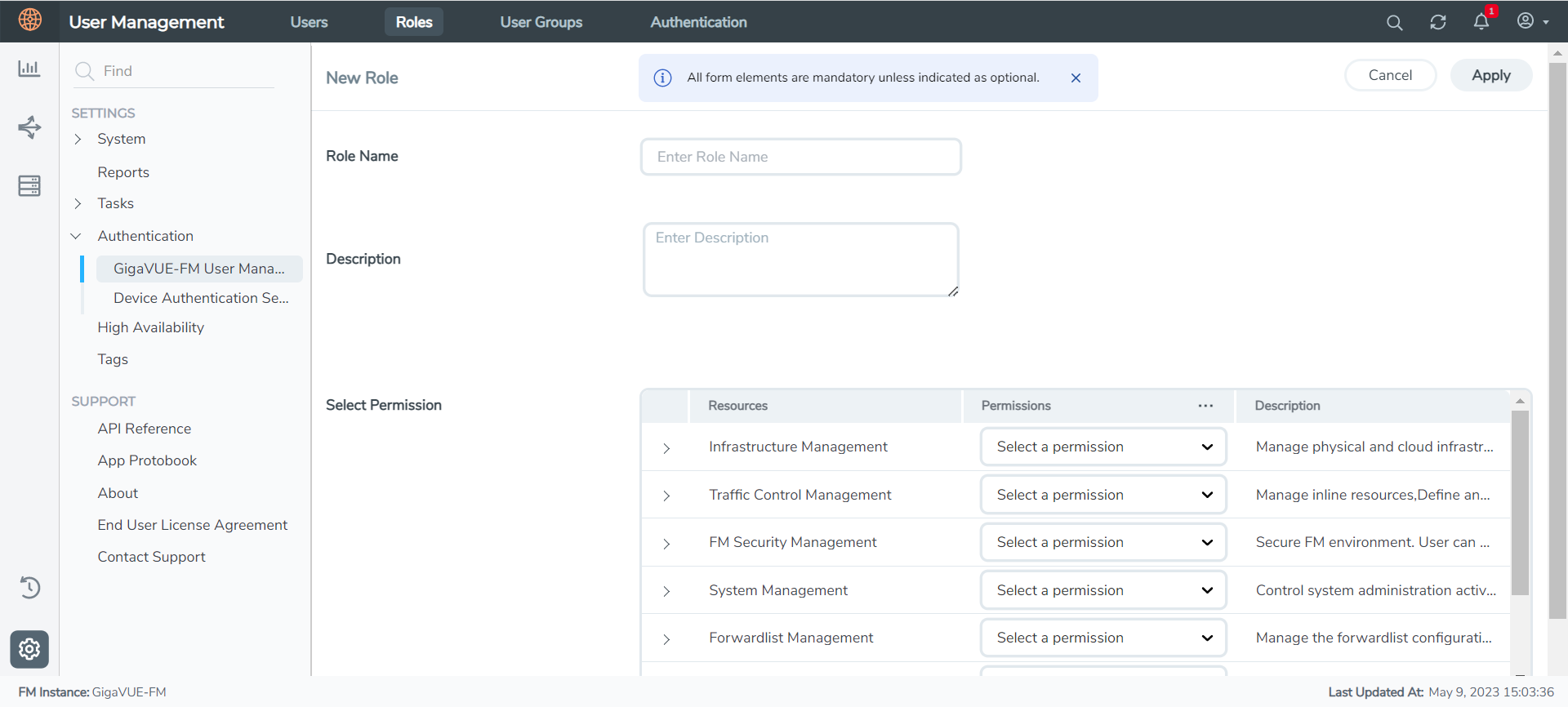 Go to Settings and select Authentication> GigaVUE-FM User Management >Roles. |