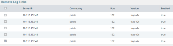 | 2. | Scroll to the bottom of the SNMP Traps page, and select the destination to delete under Remote Log Sinks. In 1, 10.115.152.40 is selected. |