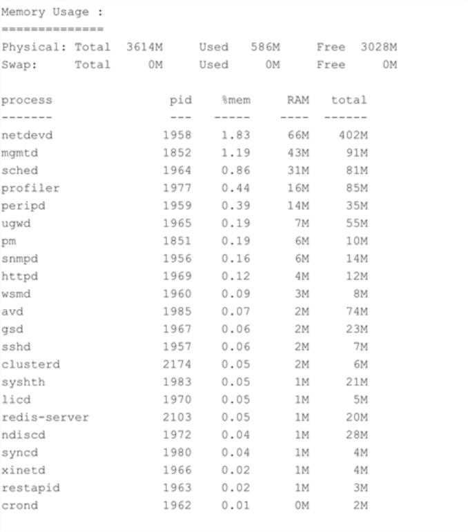 The memory usage statistics display the total, used, and free amount of physical and swap memory available, as well as the memory usage for all the processes, with the process consuming the largest amount of memory displayed at the top.