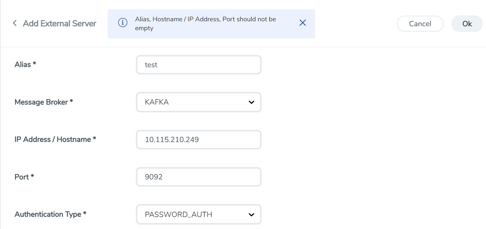 The KAFKA topic name in which the port, map and map rule stats are sent is “fm-physical-stats”. You can listen to this topic from external servers to receive the data. IP address/Host name of the external server IP address/host name of the external data server. Port Port number on which the external data server is listening. The default port is 9092. Authentication Type The authentication type used by the external data server. Can be either: