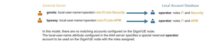In this model, you configure the GigaVUE node to accept roles passed from the AAA server. Then, you set up a local-user-name attribute for the account in the AAA server to pass a reserved account name (operator) and one or more roles to the GigaVUE node. In this case, the roles are fully assigned in the AAA server and there are no matching accounts on the GigaVUE node.