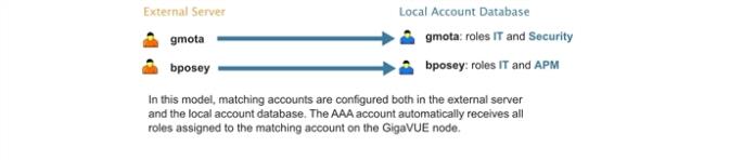 In this model, an externally authenticated user is granted the roles assigned to the account on the GigaVUE node itself. This can take place either by a matching account name (the same account name is specified both in the AAA server and the GigaVUE HC Series node), or by using the local-only option to map all externally authenticated users to a specific account on the GigaVUE node.