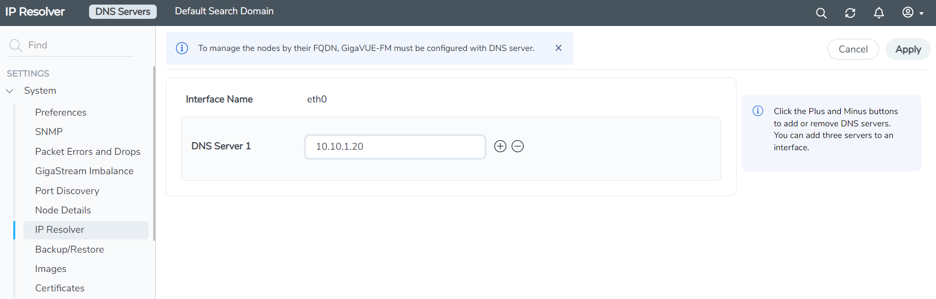 GigaVUE‑FM must be configured with DNS server and default search domains in order to add and manage the nodes by their Fully Qualified Domain Names (FQDN).