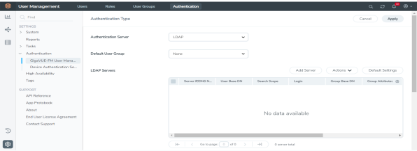 Only users belonging to the Super Admin User Group or users with write access to the GigaVUE‑FM Security Management category can use the Authentication Server > LDAP section to add entries to GigaVUE‑FM’s list of available LDAP authentication servers.