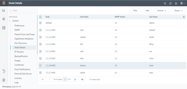 The Node Details page includes the details of every node managed by GigaVUE‑FM. The figure shows an example. For each node, you need to provide a user name and password that allow administrator privileges on the node.