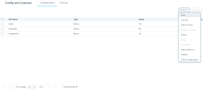To work with configuration files, use the options available when you select Settings > Config and Licenses > Configurations, which displays the Configuration Files page shown in 1.