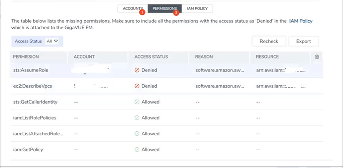 - Review the accounts that has an error in the permission status. The PERMISSIONS tab lists the permissions required to run GigaVUE Cloud Suite for AWS.