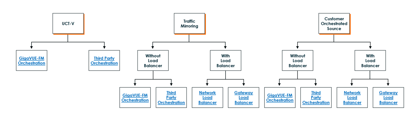 This section describes various options to configure GigaVUE Cloud Suite for AWS to provide visibility for both physical and virtual traffic. You can configure GigaVUE Cloud Suite for AWS in ten different ways, based on the traffic acquisition method and your approach to deploying fabric components.