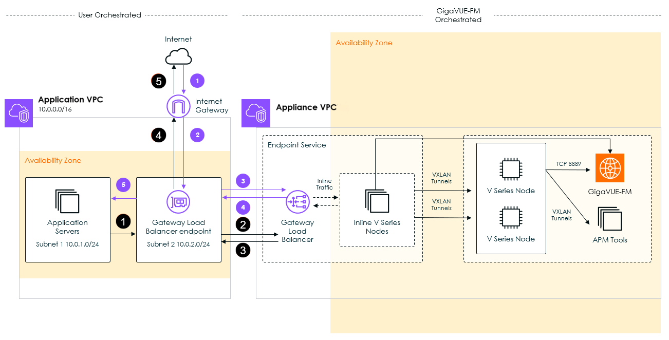 - The inline traffic is sent back to the Gateway Load Balancer endpoint in the application VPC.