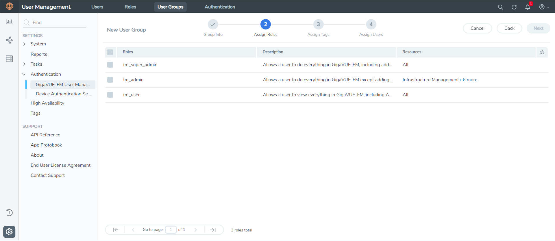 1.   Go to Settings, and then select Authentication> GigaVUE-FM User Management >User Groups.