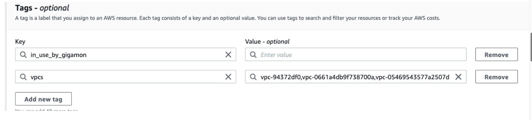 - VPC level: To filter the traffic at VPC level, in addition to the tag "in_use_by_gigamon" , add the tag "vpcs" .