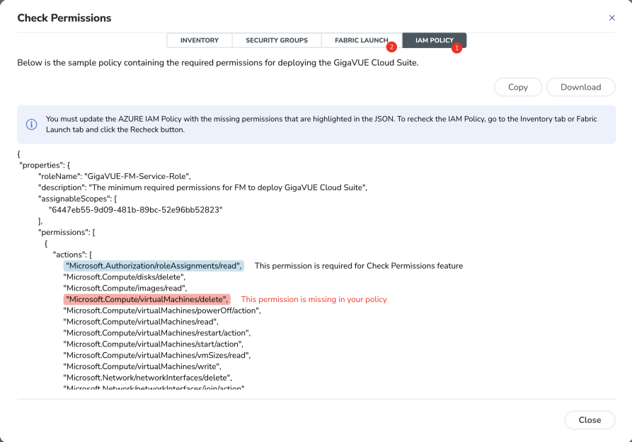 The IAM POLICY tab lists the sample policy containing the required permissions for deploying the GigaVUE Cloud Suite for Azure. You must update the Azure IAM policy with the missing permissions that are highlighted in the JSON.
