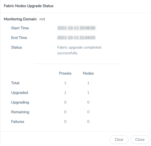 - Click Clear to delete the monitoring domain upgrade status history of successfully upgraded nodes.