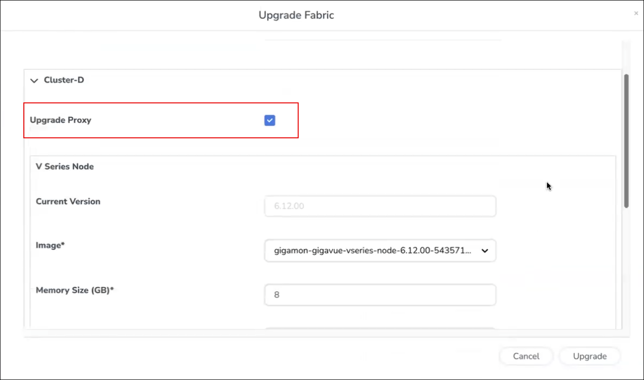 In the Upgrade Fabric dialog, if multiple clusters exist, different images can be selected per cluster. While upgrading a cluster, make sure the proxy (if deployed) is also upgraded, to maintain compatibility.