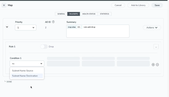 Through the map, you can drop or pass packets based on the highest to lowest rule priority. You can add 5 rule sets on a map. Use the + and - buttons to add or remove a rule set in the map. Each rule set can have only 25 rules per map and each rule can have a maximum of 4 conditions. To add ATS rules for an Inclusion/Exclusion map, you must select at least one rule condition. For details, refer to Example- Create a New Map using Inclusion and Exclusion Maps .