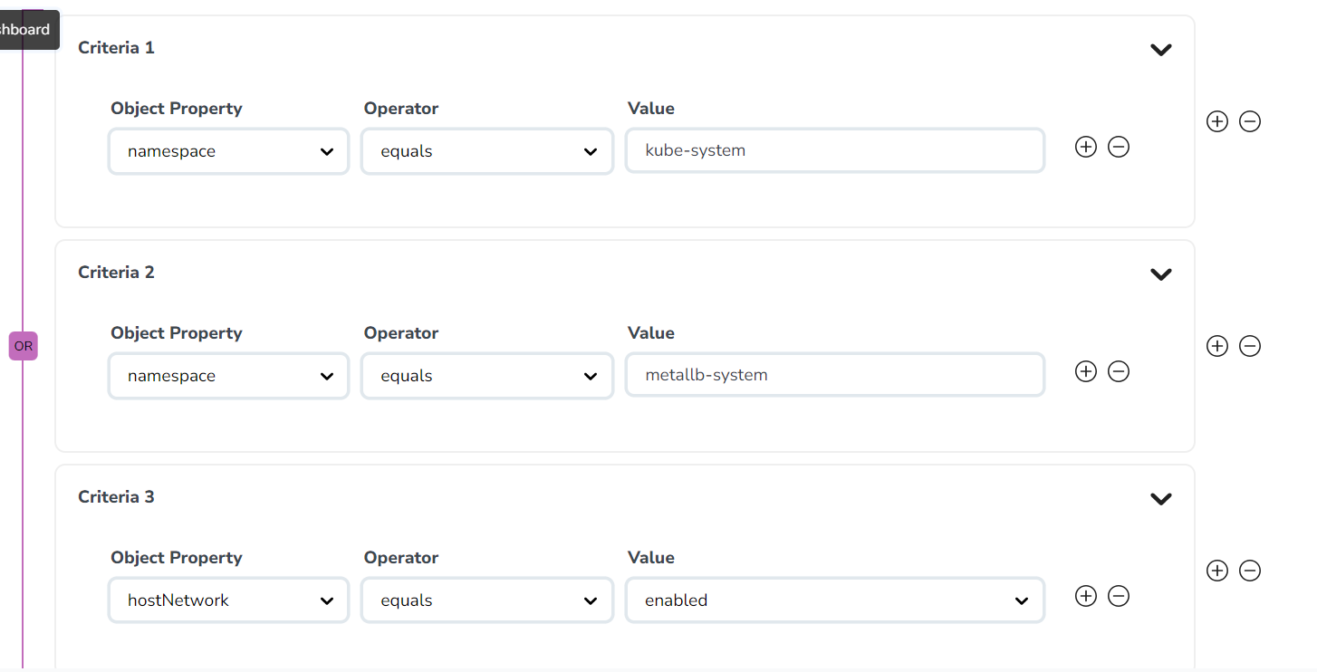 To exclude the pods from monitoring, you can add criteria to DefaultExclusion. From the drop-down list, select any of the following Object Property to exclude them from the monitoring, and provide the value for the property selected in the Value field: