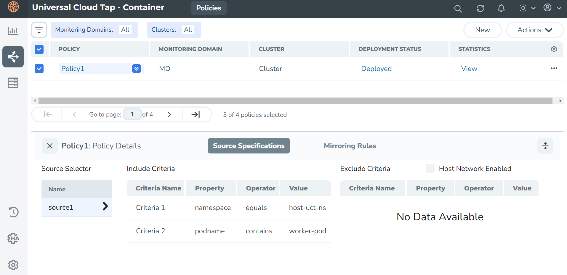 - DefaultExclusion: DefaultExclusion is a default source selector which will be applied to all policies. It cannot be deleted but can be modified. After modifying the DefaultExclusion source selector, policies need to be deployed again for the changes to take effect. DefaultExclusion appears by default on the Source Selector Specifications page.
