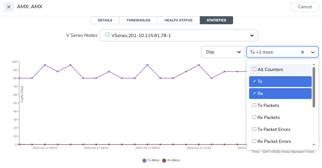 - To view the statistics of a particular GigaVUE V Series Nodes, select the required GigaVUE V Series Node from the V Series Nodes drop-down menu.