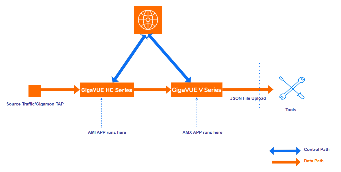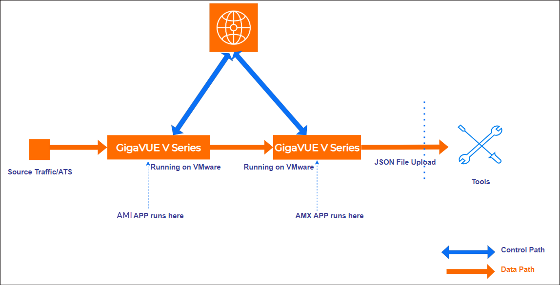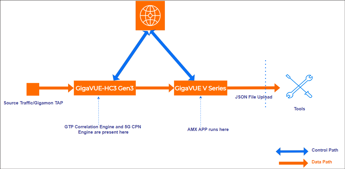 In hardware deployments, the GTP Correlation Engine runs on a physical node/cluster, and the AMX application is deployed on a GigaVUE V Series Node running on VMware ESXi. The output from the GTP Correlation Engine in Flat JSON format is sent to the AMX application in GigaVUE V Series Node. The performance of the device and the application is managed by GigaVUE-FM. The GigaVUE-HC3 Gen3 devices support the integration of AMX application.