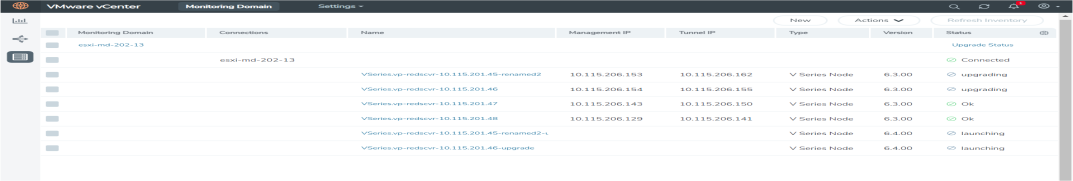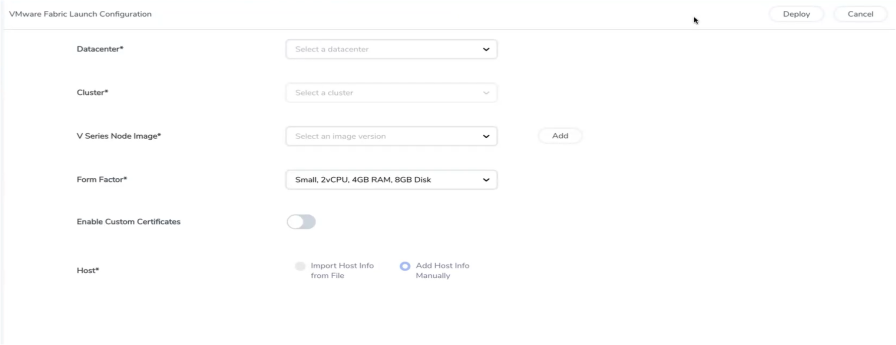 Form Factor Instance size of the V Series node. Refer Prerequisites for Integrating V Series Nodes with VMware vCenter for more information. - Click Deploy. After the V Series node is deployed in vCenter, it appears on the Monitoring Domain page under Fabric tab of the selected Monitoring Domain.