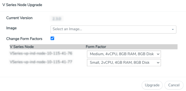 The V Series Node Upgrade dialog box displays the current version of the V Series Node image. Select the latest V Series Node OVA image from the Image drop-down list. If you want to modify the form factor (instance) size, click the Change Form Factors check box. When you are upgrading more than one V Series node, you can modify the form factors of each V Series nodes individually using the drop-down list.