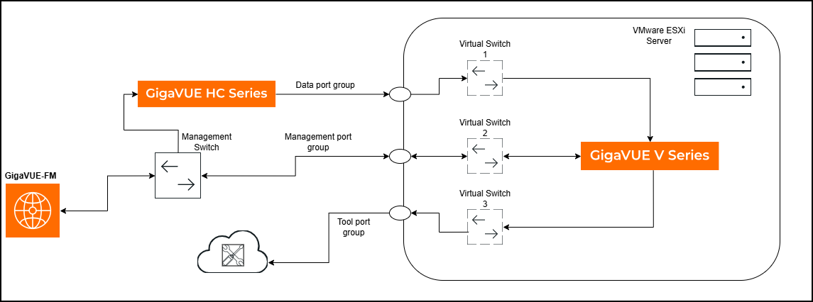 ■   Configuring port groups: Create a Management Port Group for connectivity with GigaVUE‑FM, a Data Port Group to receive data from the H Series node, and a Tool Port Group for connectivity with the tools.