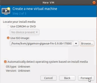 | 3. | Browse and select the location from where to upload the GigaVUE‑FM ISO image, and then select the Automatically detect operating system based on install media check box. |