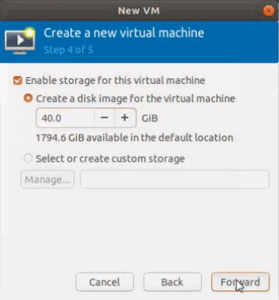 | 5. | Select the Enable storage for this virtual machine check box, and set the Size to 40Gb. |