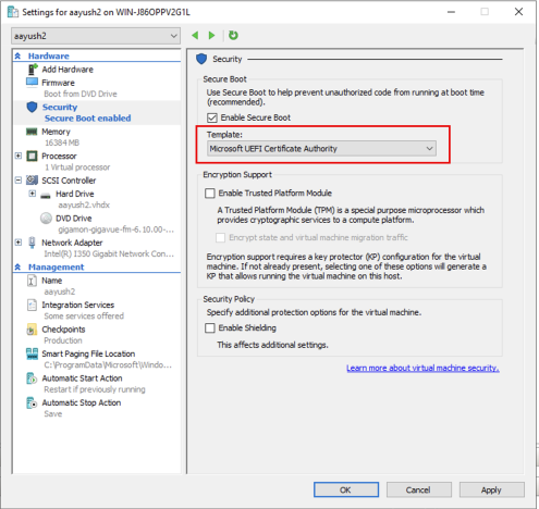 - On the Security page, select the Microsoft UEFI Certificate Authority from the template drop down and click on Apply.