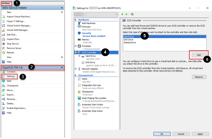 - In Hyper-V Manager, from the Actions pane, select the newly added GigaVUE‑FM virtual machine, and then click Settings.