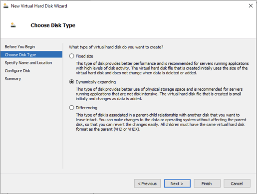 - Select the required disk type for the virtual hard disk, and then click Next.