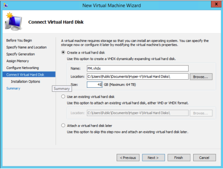 - Select the Create a virtual hard disk option and set the Size to 41GB.