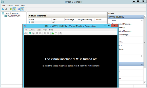 | 1. | In Hyper-V Manager, locate the Virtual Machines entry in the results pane and select the GigaVUE‑FM virtual machine. |