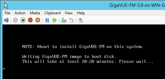 The next step is to connect to the GigaVUE‑FM virtual machine from within Hyper-V Manager and start it. This begins the actual installation of the GigaVUE‑FM Virtual Appliance from the connected ISO image file. Once GigaVUE‑FM finishes installing from the ISO image file, you will then disconnect the ISO image file and restart the virtual machine.