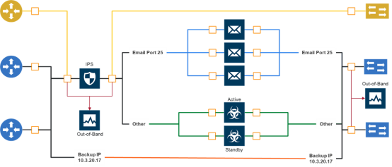 | In the middle of the figure, the Email and Other traffic represents network traffic flows that go through IPS inspection first, and then the Email traffic goes to dedicated inspection tools, here shown as three tools in an inline tool group, and the Other traffic goes to a threat protection active/standby pair. |