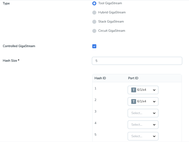 The hash size value determines the number of hash bucked IDs and ports available for assigning to the GigaStream. For example, in 3 Controlled GigaStream with Five Hash IDs and Port IDs, the Hash Size is set to 5 so the GigaStream page displays five Hash IDs and five Port ID fields.
