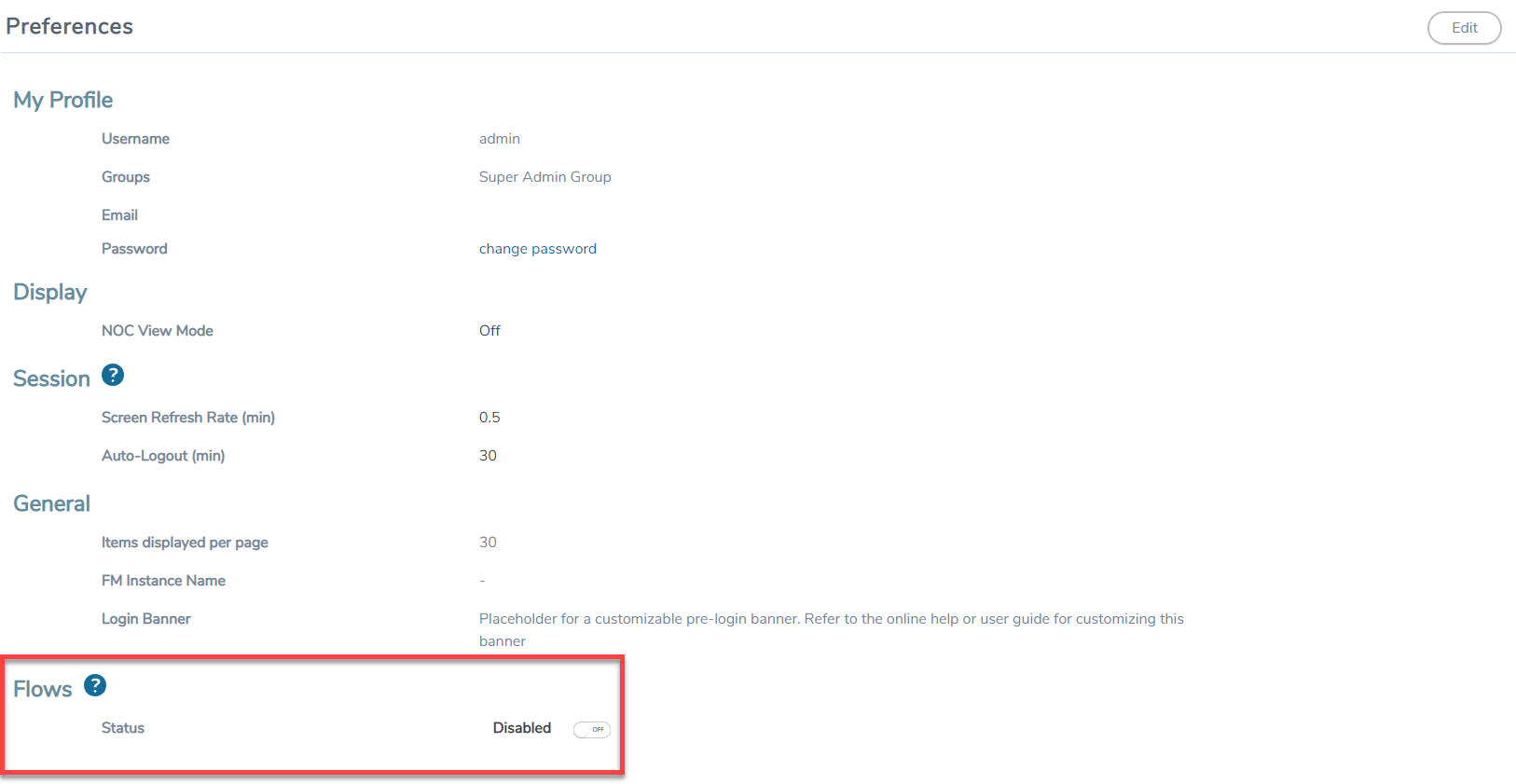 - On the Edit Preferences page, under Flows, change the status to Enabled.