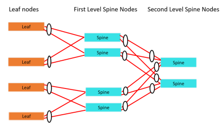 In a Spine-Leaf cluster, the number of leaf nodes is typically higher than the number of spine nodes. In the figure, there are four leaf nodes, four first level spine nodes, and two second level spine nodes. The leaf nodes aggregate to a fewer number of spine nodes.