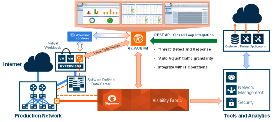 Virtual GigaVUE Nodes – GigaVUE‑FM also extends the GigaVUE feature set into the virtual space by allowing for the discovery, configuration, and management of the new GigaVUE-VM virtual traffic visibility node. GigaVUE-VM provides powerful Flow Mapping® technology for the traffic flowing between virtual machines, allowing you to distribute cloud-based traffic to physical tool ports in the visibility fabric. |