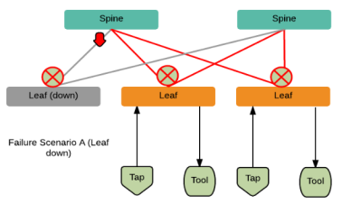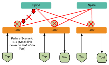 | stack link failure on a leaf node (not connected to a tool, but can be connected to a network TAP). Refer to Stack Link Failure on Leaf (TAP Connected). |