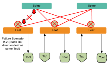 Refer to the following figure for a failure in which a stack link between the leaf and spine nodes fails and the leaf node is connected to a tool.
