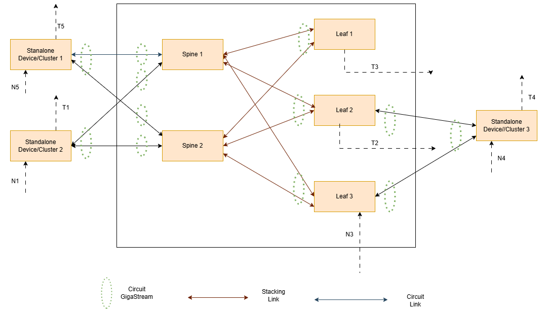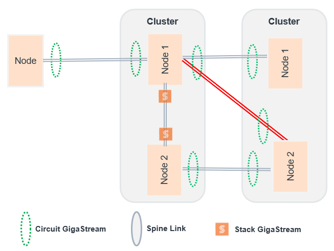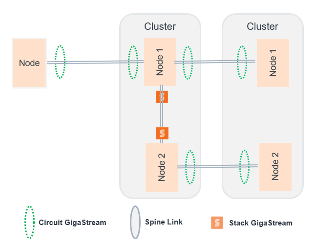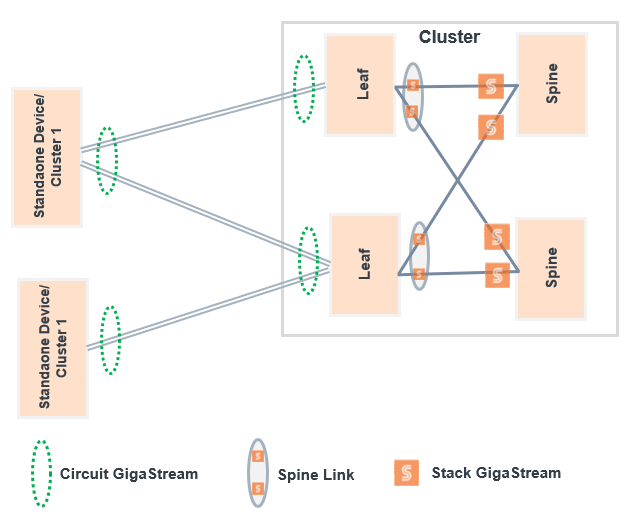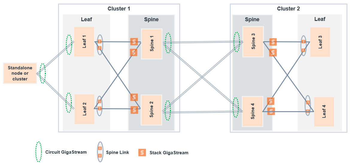 In this topology, multiple standalone nodes and/or non-leaf and spine clusters are connected using circuit GigaStreams.