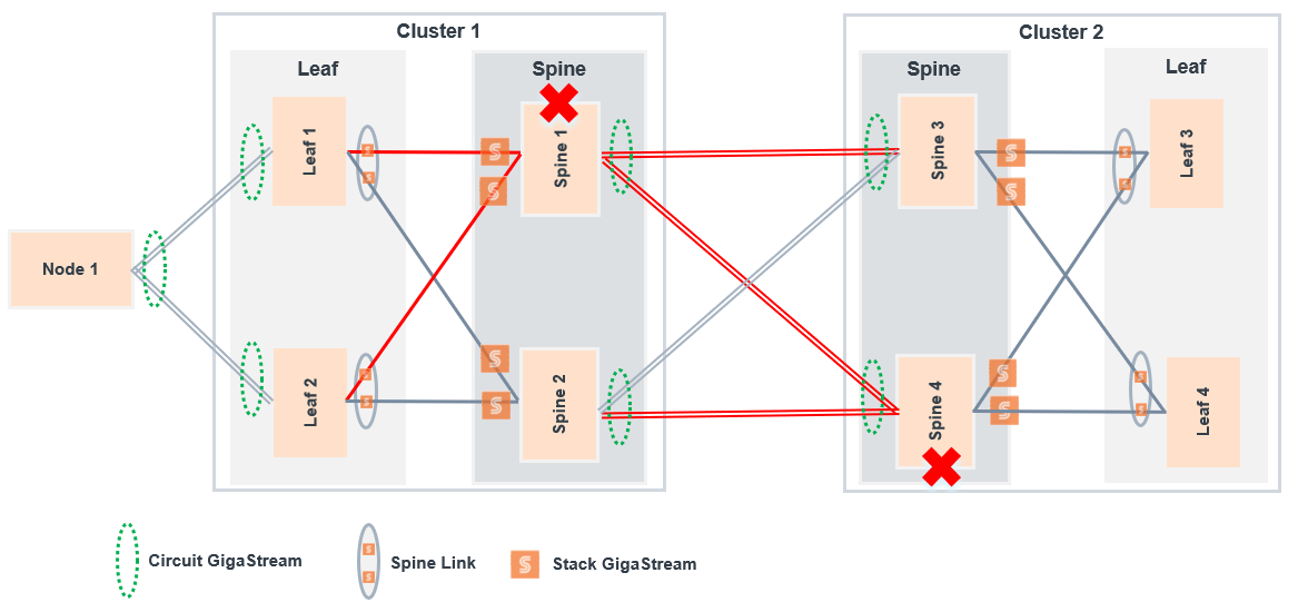 - Scenario 1: Circuit links connecting the spine nodes across cluster is down