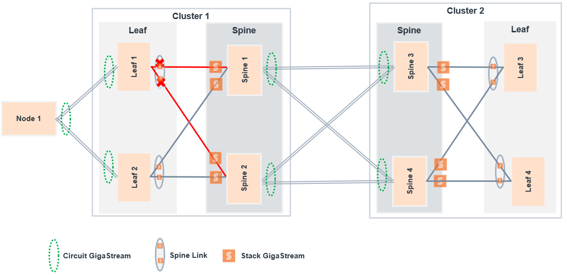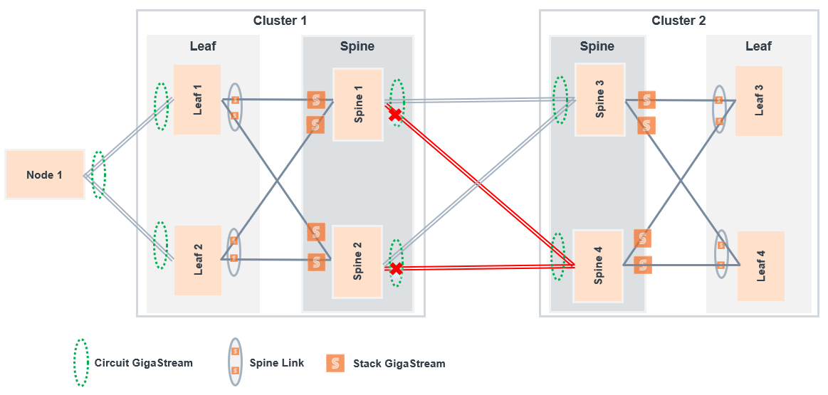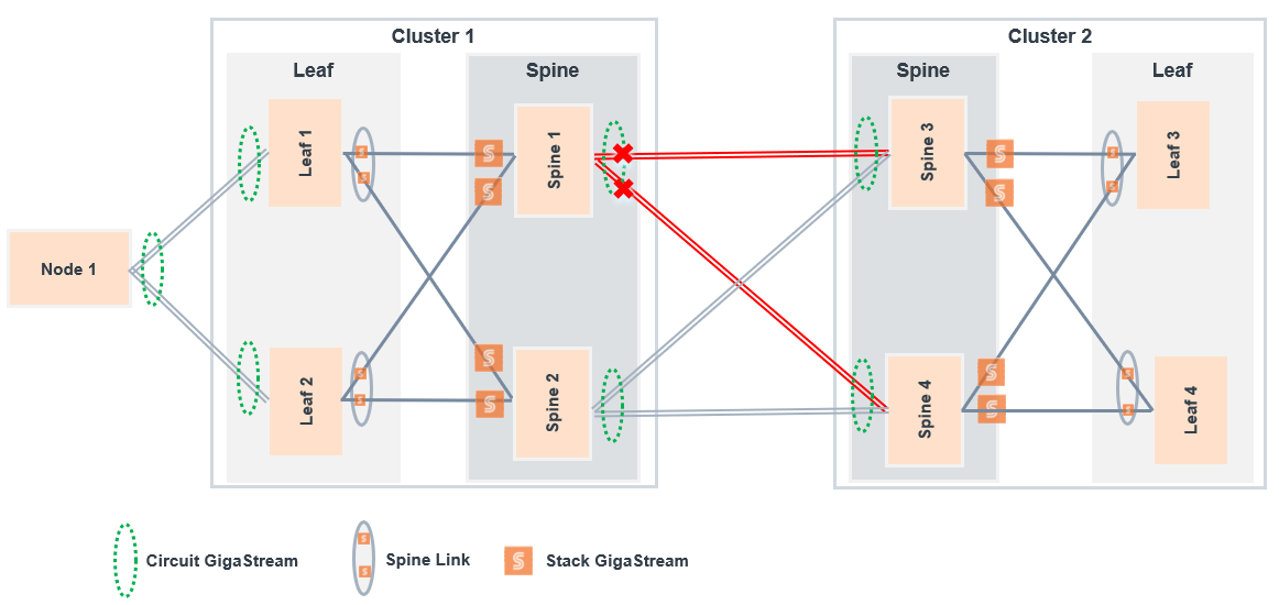 Traffic received on Spine 1 will not be delivered to the adjacent cluster as the following circuit GigaStreams are down: