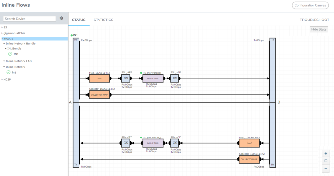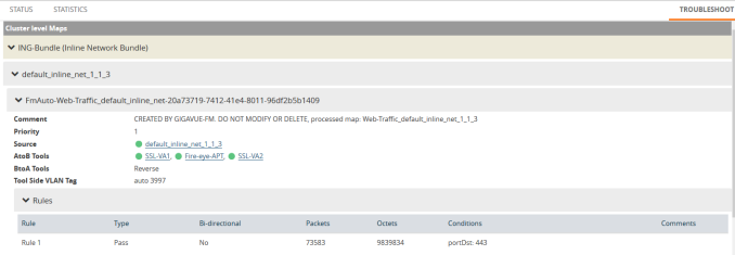 The Troubleshoot tab provides details about the device-level maps that are created for the selected inline network. The details include the source of the map, inline tools or inline tool groups used in the A to B and B to A directions, tool side and network side VLAN tags, and OOB copies. Click the required component to view its configuration details. It also provides details about the map statistics. In case of inline tool group, you can view the list of inline tools that are associated with the inline tool group. Click the required inline tool from the list to view its configurations. Refer to the following figure for details.