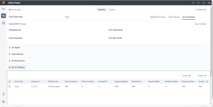 The GS Engine drop-down menu provides information on the ICAP session statistics. Click Clear GS Stats to clear the statistics of the GS group.