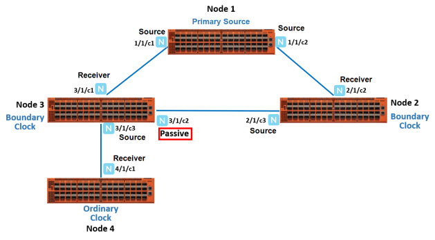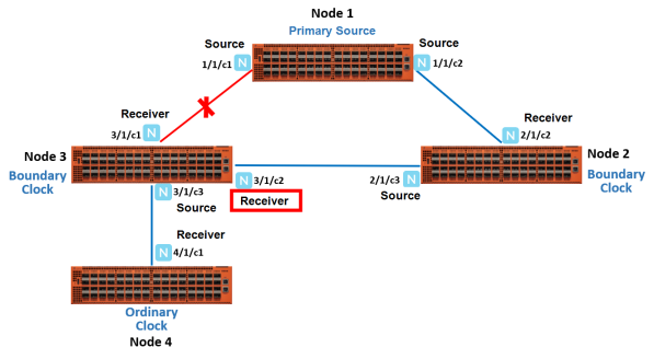 In this example, you have node 1, which is a top-level device that acts as a primary source. This device is linked to node 2 and node 3, which are boundary clocks. Node 3, in turn is linked to node 4, which is an ordinary clock. All these devices are synchronized in a source-receiver hierarchy. Node 3 is synchronized with the primary source through the network port, 3/1/c1, which acts as a receiver. The other port 3/1/c2 on node 3 is in passive state. When the link between the primary source and node 3 goes down, the network port, 3/1/c2, which was in the passive state transitions to receiver state. This will ensure that node 3 as well as node 4 remain synchronized with the primary source through node 2 (refer to 2).