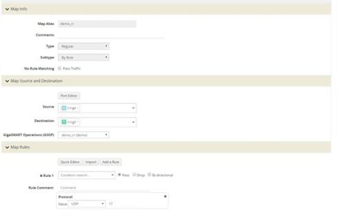 Click New, then type an alias for the map, select type Regular and subtype ByRule. Under Map Source and Destination, select a network port as the Source and a tool port as the Destination, then select the GigaSMART operation. Under Map Rules, configure a map rule. Refer to 2 New Map Configuration. |