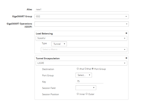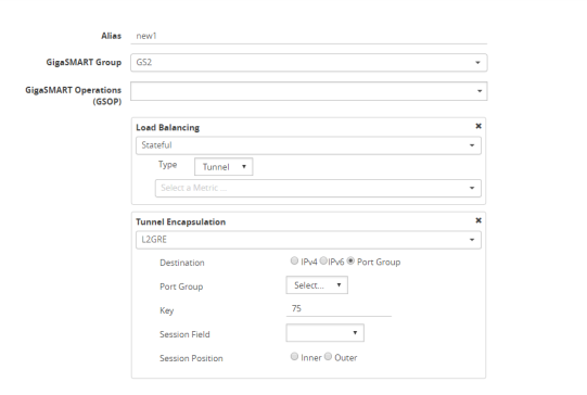 Click New, then select the same GigaSMART Group and Tunnel Encapsulation for the GSOP. Under Load Balancing, select Stateful, the type Tunnel, and the metric, such as Round Robin. Under Tunnel Encapsulation, select L2GRE, Destination Port Group, select the Port Group, Session Field, and Session Position. Refer to 1 New GigaSMART Operation for Stateful Load Balancing. |