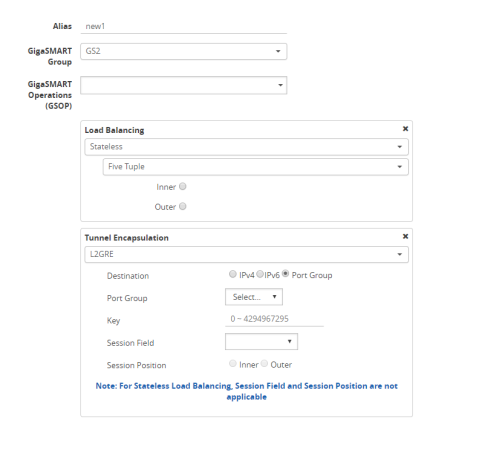 Example 3 has the same configuration steps as Example 2 except for the GigaSMART operation (gsop) in Step 16. Under Load Balancing, select Stateless and the metric, such as Five Tuple. Under Tunnel Encapsulation, select L2GRE, Destination Port Group, and select the Port Group. Refer to 3 New GigaSMART Operation for Stateless.